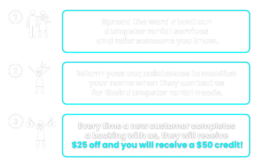 Simply inform your acquaintances to mention your name when they contact us for their dumpster rental needs. Once they complete their booking, we’ll gladly credit $50 to your account for your next dumpster rental.